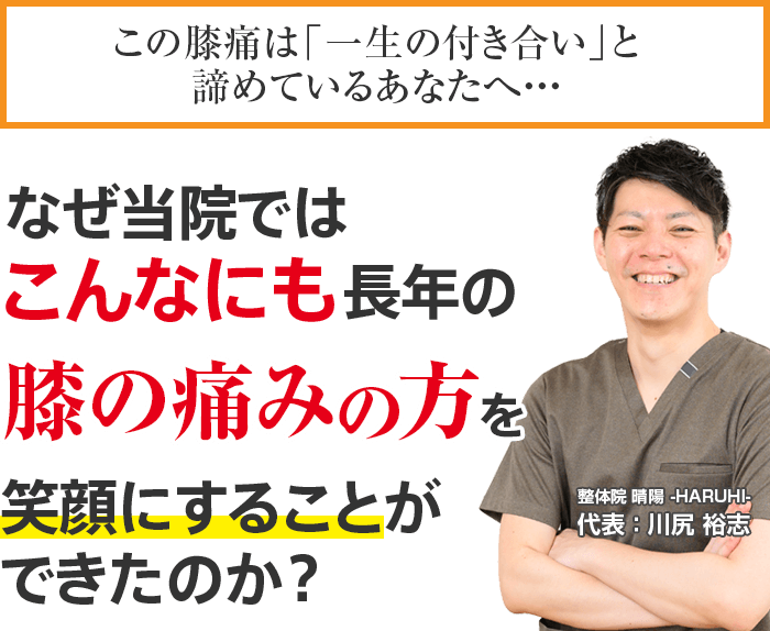 もしあなたが今、上記のようなお悩みがあり、ほんの少しでも心のどこかで良くなりたい!と思われているなら、整体院 晴陽-HARUHI-に来院し、そのつらい膝痛を根本から改善しませんか?私が必ず、あなたの力になってみせます。